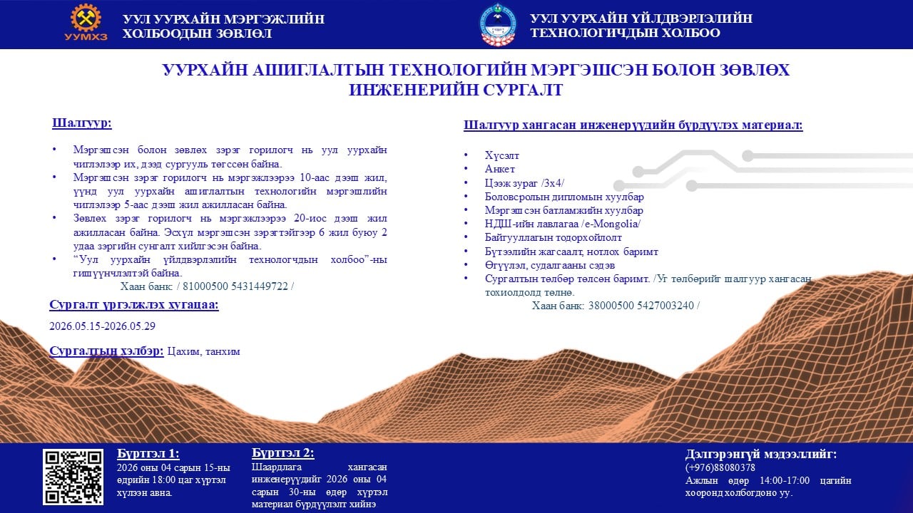 УУЛ УУРХАЙН МЭРГЭШСЭН, ЗӨВЛӨХ ИНЖЕНЕРИЙН СУРГАЛТ-ын бүртгэл: 2026.04.15-ны өдрийг хүртэл хүлээн авна.