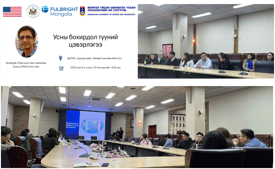 Агуулагч чулуулгийн шинжээс хамаарч газын доорх усны найрлагын өөрчлөмтгий байдлыг судлах лаборатори байгуулах, сургалтын болон судалгааны чадавхыг нэмэгдүүлэх зорилгоор ШУТИС-ийн ГУУС-ийн Гидрогеологи, инженер геологийн тэнхимд усны бохирдол, түүний цэвэрлэгээгээр мэргэшсэн доктор Ачал Гарг 2025 оны 8-р сарын 25-аас 9-р сарын 25-ны хооронд 1 сарын хугацаатай ажиллалаа. Тэрээр ашиглахад хялбар зөөврийн 4 багаж хандивлаж, “Газрын доорх усны чанарын хяналт ба сорьц авах арга зүйн сургалт”-д усны бохирдол, чанарын баталгаажуулалтын талаар хичээл оров.