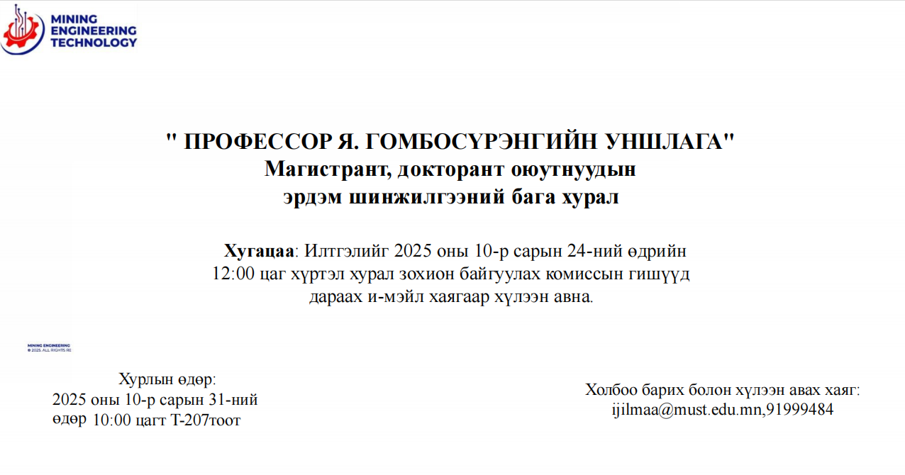 "Уул уурхайн технологи, эдийн засаг, экологи, геодези, маркшейдер" багш нарын ЭШ-ний 53-р бага хурал 2025 оны 11-р сарын 14-нд болно.