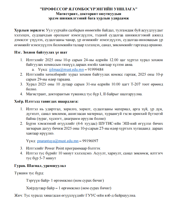 "Профессор Я.Гомбосүрэнгийн уншлага" магистр, докторант оюутны ЭШ-ний бага хурлын зар, удирдамж