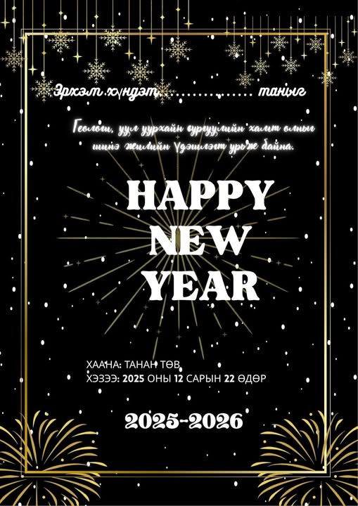 ГУУС-ийн Шинэ жилийн үдэшлэг 2025 оны 12 дугаар сарын 22-ны өдөр жилийн хамгийн урт шөнө “Танан төв”-д ёслол төгөлдөр зохион байгуулагдана. Эрхэм хүндэт хамт олон та бүхнийг Шинэ жилийн үдэшлэгтээ өргөнөөр оролцохыг урьж байна.