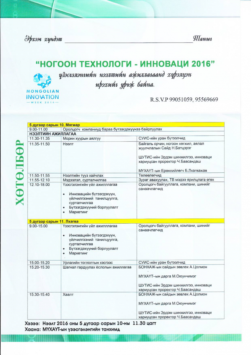 "Ногоон технологи-инноваци 2016" үзэсгэлэн, зөвлөгөөний хөтөлбөр