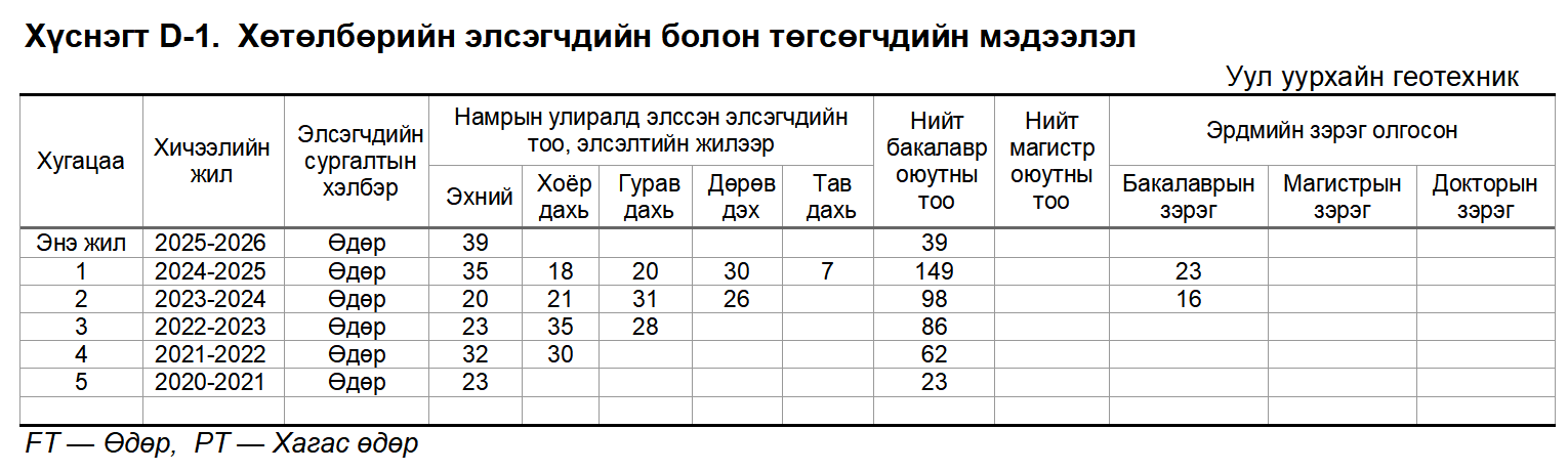 Уурхайн технологийн тэнхим (УТТ) нь 1971 онд анх байгуулагдсан бөгөөд 1975 онд Уул уурхайн ашиглалтын технологи мэргэжлээр бакалаврын зэрэг олгож эхэлсэн. Тус тэнхим нь оюутнуудыг уул уурхайн салбарт амжилтанд хүргэх үүднээс шаардлагатай мэдлэг, ур чадвар, туршлагаар хангах зорилгоор бакалавр, магистр, докторын сургалтын хөтөлбөрөөр Уул уурхайн ашиглалтын технологи, Уул уурхайн маркшейдер мэргэжлийн инженерүүдийг болон бакалавр, магистрын хөтөлбөрөөр Уул уурхайн геотехник мэргэжлийн инженерүүдийг тус тус бэлтгэж байна. Монгол Улсад геологи, уул уурхайн салбар эрчимтэй хөгжиж байгаа нь мэргэшсэн мэргэжилтнүүдийн эрэлт, хэрэгцээг эрс нэмэгдүүлсэн. Энэхүү өсөн нэмэгдэж буй эрэлт, хэрэгцээг хангах үүднээс ШУТИС, Рио Тинто Монгол ХХК (Рио Тинто Групп), Оюутолгой ХХК хамтын ажиллагаан гэрээний хүрээнд хамтран 2021 онд уурхайн геотехникийн мэргэжилтнүүдийг эх орондоо бэлтгэх шийдвэрийг гаргасан. Энэхүү хөтөлбөрт 2020-2025 он хүртэлх элсэгчдийн болон төгсөгчдийн мэдээллийг Хүснэгт D-1-д үзүүлэв.